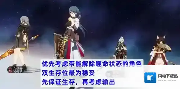 生存位优先考虑能解除噬命状态的角色,比如罗刹和娜塔莎,然后再搭配一个存护角色,比如杰帕德或者火主,双生存位是面对幻胧最稳妥的选择。剩下的两个位置留给练度最高的输出和辅助角色,考虑到幻胧和玄莲的弱点属性,雷、风和虚数属性的输出角色会更占优势,比如景元和刃。
