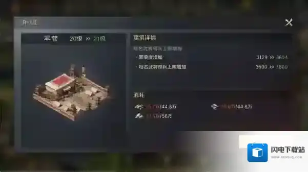 四、君王殿10级后注意事项在主线任务做到16章,升完君王殿10级后,这时我们主线章节会卡在25000部队数量或者队伍等级45级这里。这时候直接升级军营即可提升部队带兵数量。