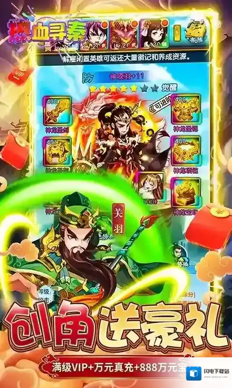 1、创角即送满级VIP、200秦晶、10000元真充卡、8888万金币、888万元宝、5000体力