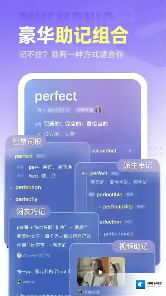 基于超级记忆原理,为单词提供正统、巧记、搞笑、笔记四种记忆模式,强大您的单词记忆网络!