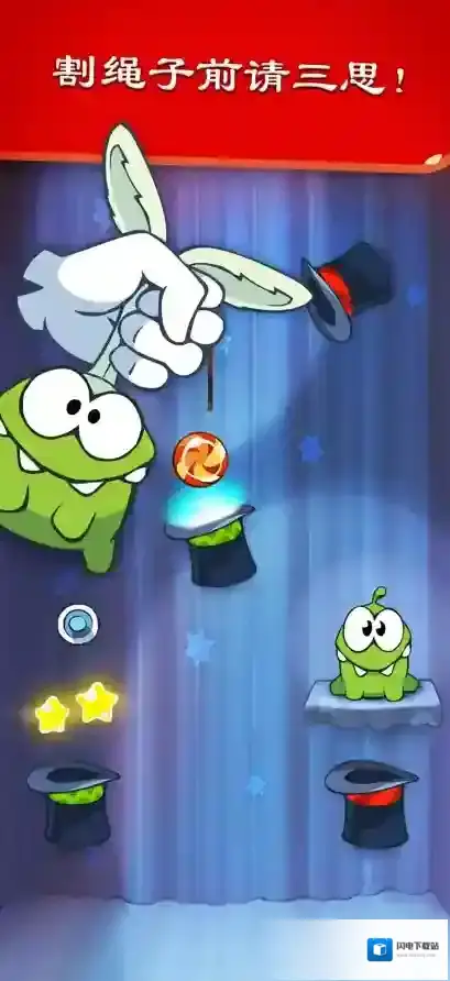 1、游戏中,玩家要剪断绳子,让糖果可以将周围的星星击破又能进入Om Nom 嘴巴。
