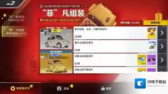 1月18日至3月7日登录巅峰极速,参与排位模式并战胜指定对手,可获得随机车辆部件。集齐底盘、车身、引擎、套件共32个车辆部件即可领取运动组传奇车辆菲亚特 Fiat 500F ’65和车辆限定套件“罗马假日”!车手们还可以进行部件交换,好友互帮互助,可以缩短收集时间更早拿到心仪奖励!免费领新车,欢聚过新春!