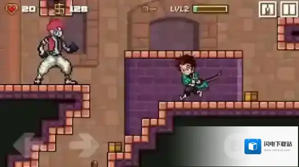 2、左上角显示红心数量为20,货币数量为128,等级标识为“LVL2”,画面中有两个角色,一名持剑的角色准备攻击上方平台的敌人。