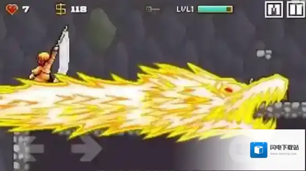 1、画面中角色正在释放火焰巨龙的技能特效,左上角显示红心数量为7,货币数量为118,等级标识为“LVL1”,底部有方向键和“A”“B”按键。