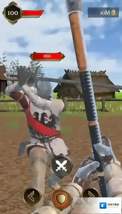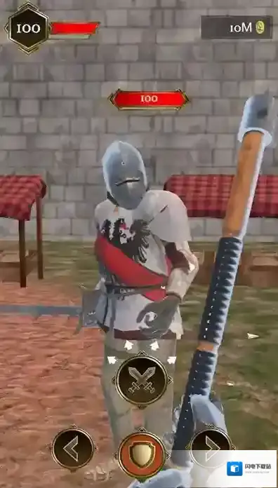 2、画面中显示两名身着盔甲的骑士在对战,上方显示双方血量均为100,下方有操作按钮,包括攻击(交叉剑图标)、盾牌防御(盾牌图标)以及方向移动按钮。