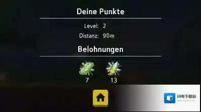 3、“DeinePunkte”、“Level:2”(等级:2)、“Distanz:90m”(距离:90米)、“Belohnungen”(奖励),还有7个金钱图标以及返回主页的房子按钮。