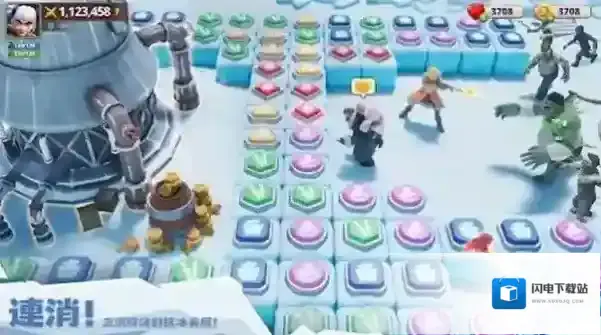 2、在消除界面,连消同色方块(红箭头),触发技能,协助战斗,突破“冰封冰层”。