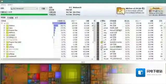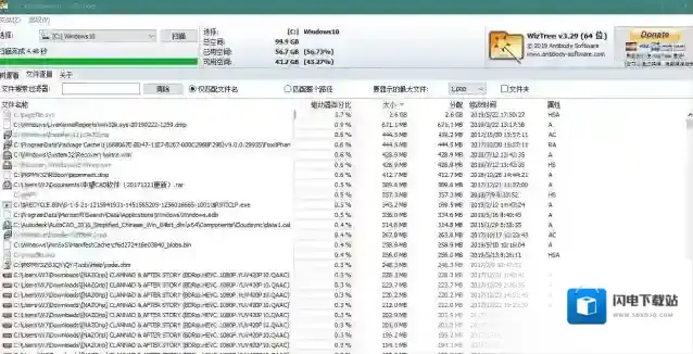 Wiztree是一个大型文件搜索工具,可用于查找占用大量分区的无用文件和文件夹。在界面中,将搜索到的文件夹按大小排列,并显示占用百分比、占用空间、文件数、子文件夹数等信息。可以直接删除,非常方便。