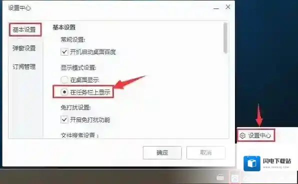 选中桌面百度图标,鼠标右键选择“设置中心”→“基本设置”→“显示模式设置——在任务栏上显示”即可切换显示位置到任务栏。