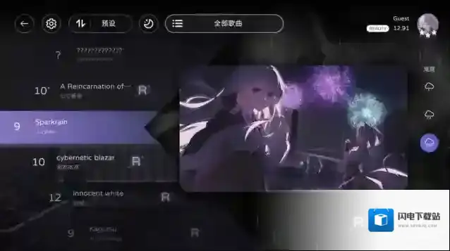 4、点击主界面的开始游戏便进入曲目选择界面。左上角的箭头可以回到主界面,齿轮进入设置,上下箭头可以更改正序/倒序排列方式,点击预设可以更换排列规则,月亮为梦之涟漪,选择涟漪可以在游玩时产生特殊效果。菜单栏可以选择章节。右上角显示玩家的名称,REALITY数值和星星数量,下面是难度和成绩以及完成百分比。上下拖动左边的曲目栏,在右边选择难度,点击曲绘即可开始游戏。