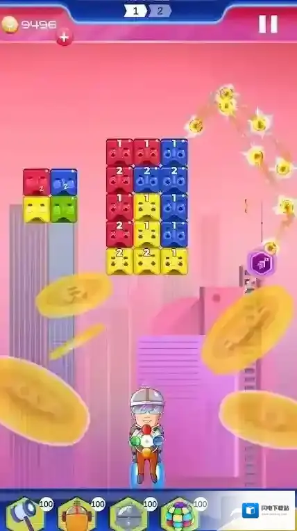 3、上方显示波数、金币数量,画面中有彩色的方块,玩家操控穿着类似宇航服、骑着火箭道具的角色,下方有各种功能按钮,可能是用于辅助消除或增强效果。