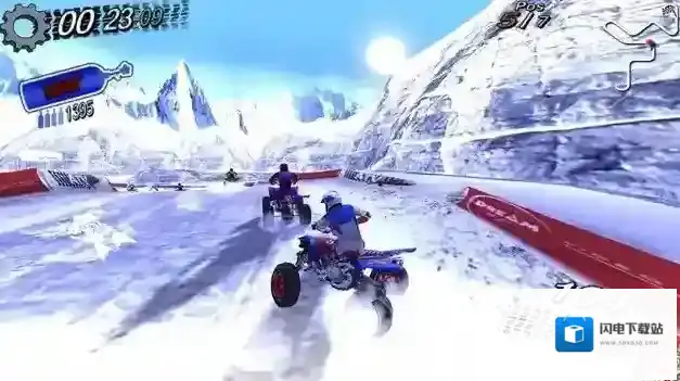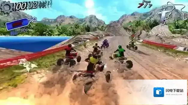 2、在“CAREER”模式,驾驶蓝白ATV,沿越野赛道,避障碍、超对手,积累比赛经验。