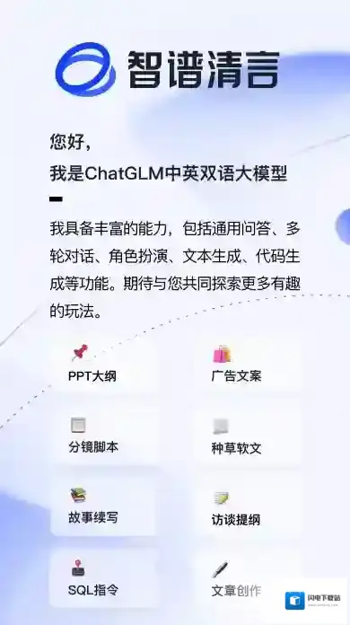 智谱清言是一个能帮你进行语音对话智能生成话语的软件,基于中英双语大模型chatglm开发,帮你“聪明一点”,每天少工作一小时。具备当前很多的丰富能力。
