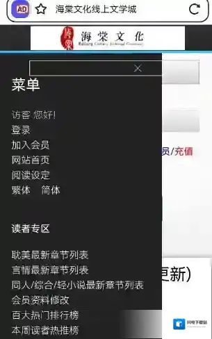 3、进入海棠小说网以后,我们点击顶部的菜单,就会从左侧弹出对应的菜单弹窗。