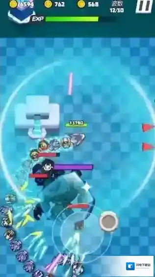1、画面有“使用摇杆来移动”操作提示,显示经验(EXP)、金币等资源,还有波次(1/10)等信息。