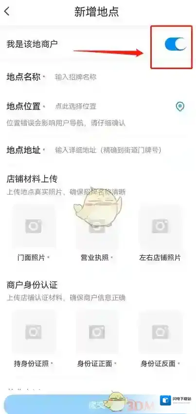 5、进入后先将我是该地商户右侧按钮开启,然后根据下方要求填写内容