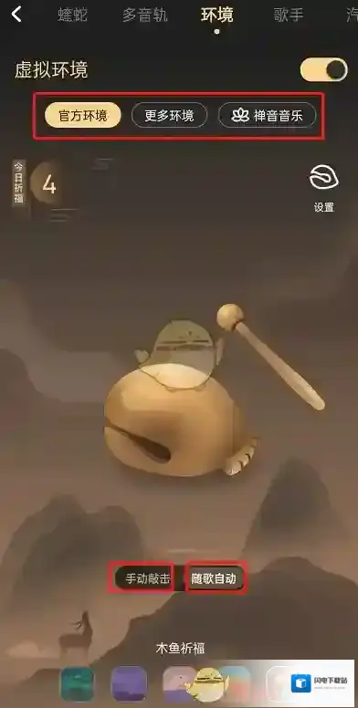 5、即可敲木鱼。可以设置音乐、环境还有敲击模式。