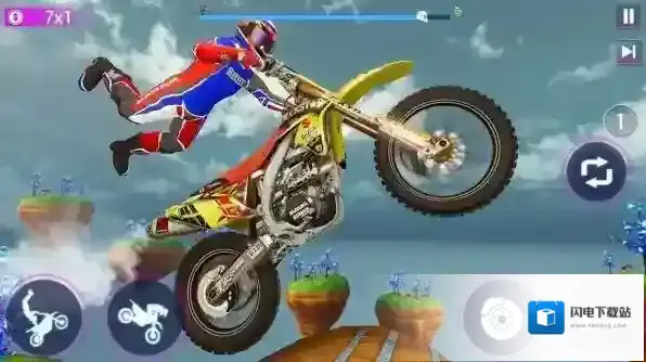3、在不同关卡(3×2、5×1、7×1等),适应场景变化(场地、空中岛屿),精准控车,完成高难度特技与竞速。