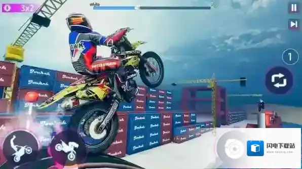1、进入游戏,操控越野摩托,在集装箱、场地等场景行驶,借右侧刹车、油门键控速度,过障碍、坡道。