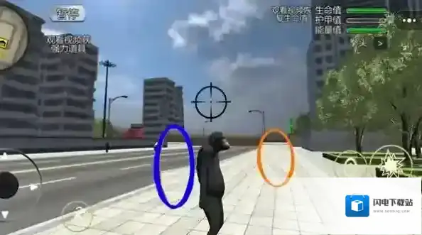 3、在街道场景,跟随箭头标记的目标路径(蓝色、橙色圈),持续移动追踪,完成关卡任务,解锁新区域。