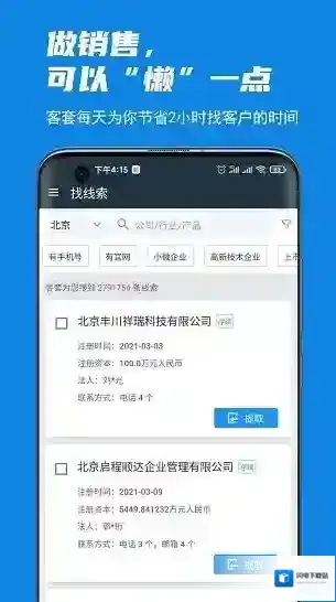–销售的时间是要用来成交的。帮助销售人员快速的获取到客源,打破销售困境,增加自己的收益;每个用户都可以查看到客户的详细信息,包括了公司的企业名称、注册资本、企业法人、联系方式等等,用户能在线获取到重要资讯,提供针对性的销售服务。