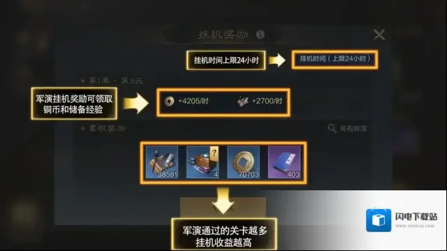军演左下方可领取挂机奖励,获得储备经验和铜币。军演通过的关卡越多,挂机收益越高,还有几率获得稀有掉落物。但挂机时间上限为24小时。