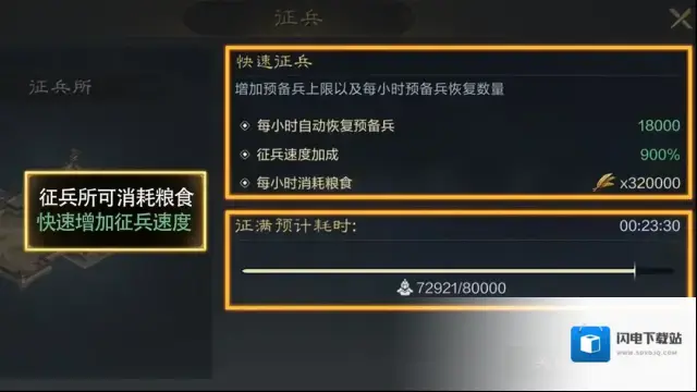 三、粮食作用:粮食主要用在征兵所,同时城外营帐中征兵时,也需消耗粮食。