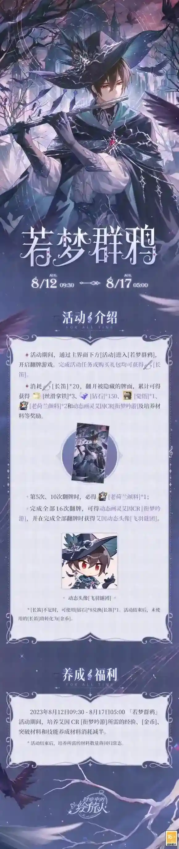 《时空中的绘旅人》全新活动「若梦群鸦」8月12日开启!8月12日09:30 – 8月17日05:00,通过主界面下方活动进入「若梦群鸦」,参与活动可得艾因CR衔梦吟游。