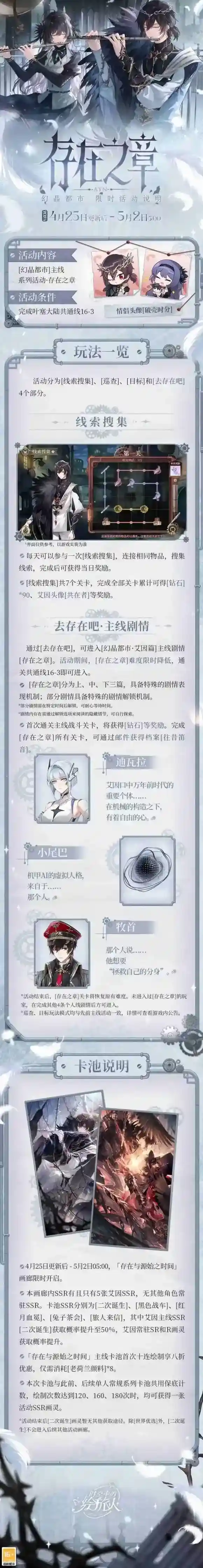 4月25日更新后 – 5月2日05:00,「存在与源始之时间」活动卡池限时开启。活动期间,艾因SSR二次诞生获得概率提升。