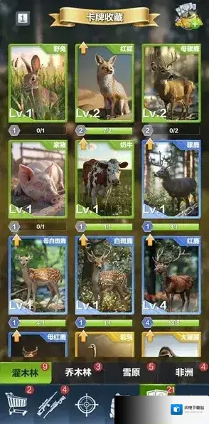2、每次狩猎都有机会获得卡牌碎片,用于解锁动物卡牌。