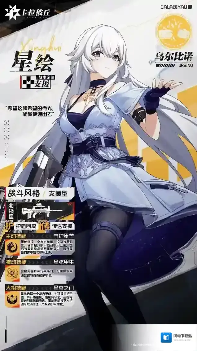 乌尔比诺星庇所的疗愈师,以守护弱者、救助伤患为任,其特殊的治疗方法在卡拉彼丘得到了一定认可。使用星空的力量守护同伴,为队友提供各种支援。