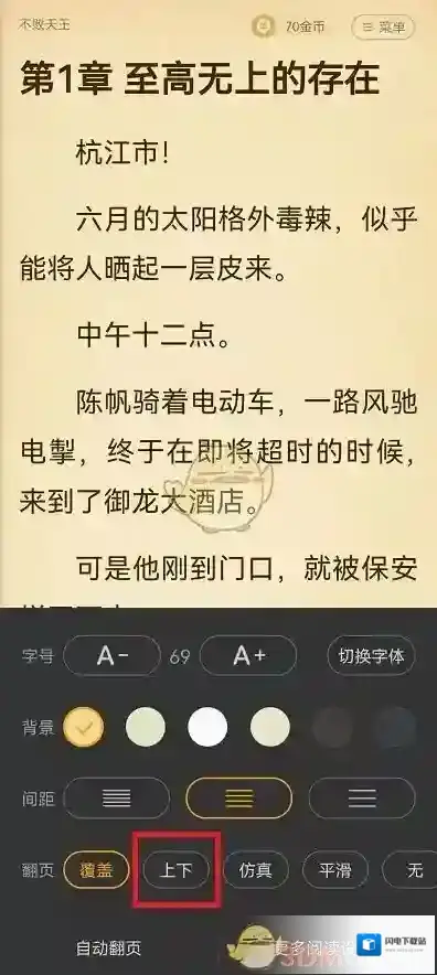 1、首先需要进入软件中,然后打开小说,进入到小说阅读界面中; 2、在小说阅读界面中,我们需要点击中间位置,呼出阅读设置功能界面,然后点击右下角的阅读设置; 3、在此功能界面中,我们就可以看到翻页的方式,然后我们点击选中翻页方式就可以了。 本文内容来源...2025-07-15 -