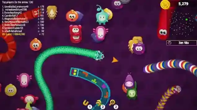蠕虫大作战(Worms Zone),经典贪吃蛇玩法的一款休闲竞技游戏。在游戏中,我们需要控制自己的蠕虫不断移动,寻找场景中的食物吞食,以此来不断增长自己的长度,然后利用自己修长的身躯去追堵其他玩家的蠕虫,将其他蠕虫击杀后还会留下满地的食物,让你更快的成长!除此之外,游戏中还有着各种道具可以使用,帮助你的蠕虫更好的成长,而且还有着丰富多样的皮肤可以使用,用个性十足的蠕虫进行挑战!