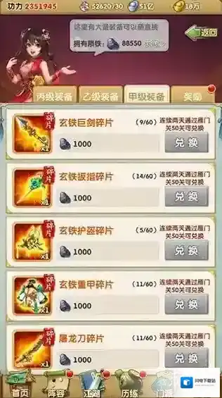 血战装备兑换通过消耗陨铁兑换装备碎片,合成获得整件装备。