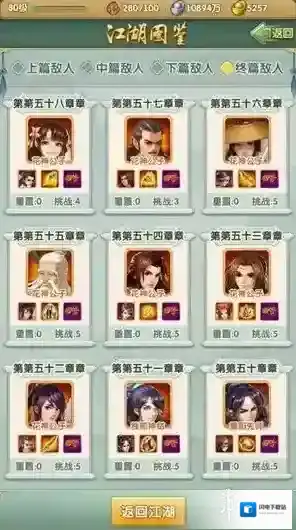 江湖由多个大章节组成,每个大章节包含不同的小关卡。