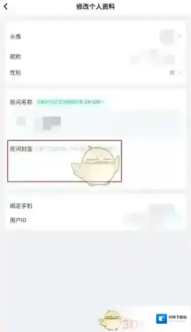 4、然后进入修改个人资料界面,在这里可以对自己的头像、昵称等信息做出修改,点击下方的房间封面选项;
