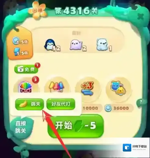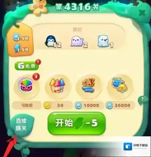 在开始关卡的页面里再点击左侧的直接跳关文字。