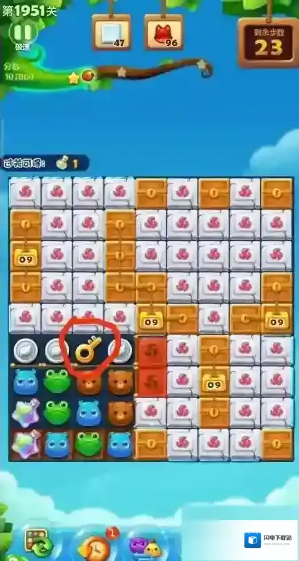 5.10把钥匙消除后才能解锁被锁住的区域,这时候就可以用五角瓶全屏消除了。之后出现被花骨朵包住的小狐狸头,要在旁边消除三次才能释放小狐狸头,所以要尽量在旁边进行消除,免得浪费步数。