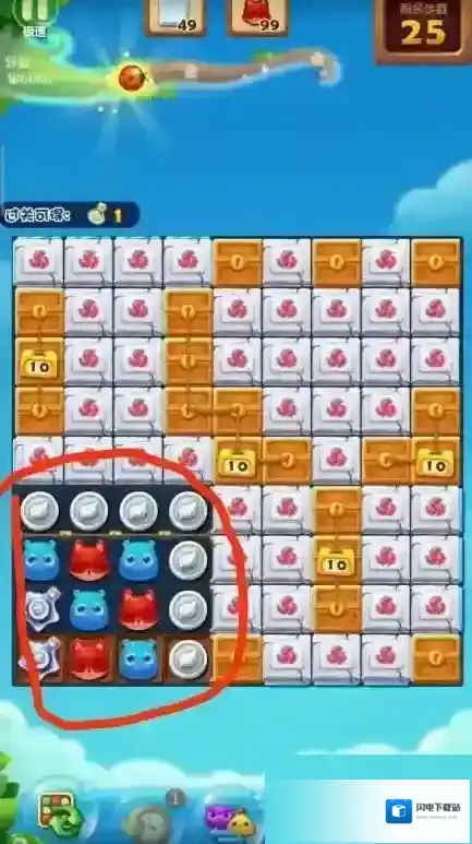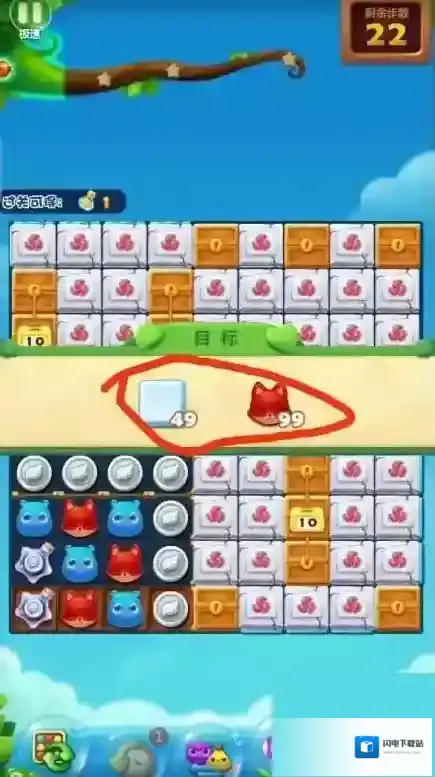 2.过关需要条件:需要消除49个冰块和99个小狐狸头。