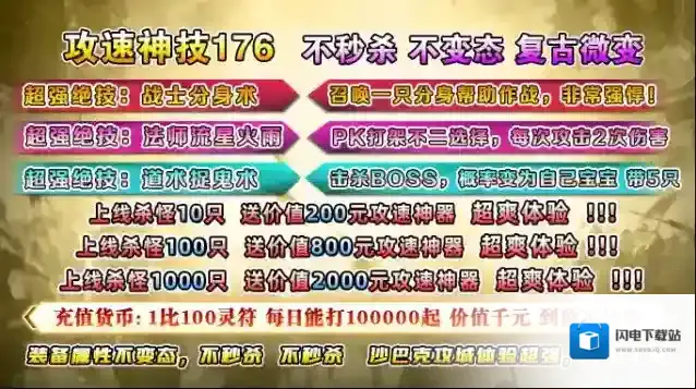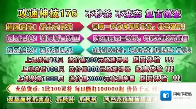 毒王攻速神技176,全新三职业微变神器版本,持久又耐玩,不秒杀,PK体验非常丝滑!战、法、道三大职业各有各的特色,并且还有专属的神技可以学习,无论是击杀BOSS还是PK都很爽!特色攻速神器只需打怪即可免费白嫖,助你畅快刷怪,升级打宝两不误!本服的装备属性不变态,功能简单,普通材料消耗大,持久又耐玩,花时间人人都有机会追梦!