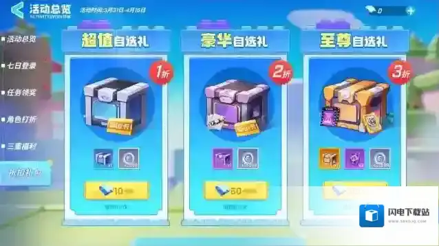 3月31日至4月16日期间,超值礼包限时登场~1元超值礼包:传说幸运卡*2 / 蓝银卡包*8 / 点券*488 (三选一)+ 白金币x28886元豪华礼包:传说幸运卡*3 / 火箭筒碎片*600 / 暗紫卡包*2 / 点券*1088 (四选一)+ 白金币x1888830元至尊礼包:传说幸运卡*10 / 赛季胶卷*36 / 灵感胶囊*6 / 耀金卡包*1 / 点券*3688 (五选一)+ 暗紫卡包x3 + 白金币x32888三种礼包每个仅购一次!超低折扣价请注意在活动期间购买,千万不要错过啦!