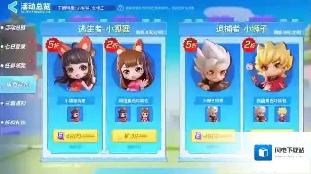 3月31日至4月16日期间,少年们可以用特惠价格购买未拥有的角色及时装!另外,少年们需注意活动期间内,会定期更换特惠出售的角色,有心仪角色特惠出售的话请注意不要错过了~第一轮:3.31-4.3小狐狸+中式旗袍套装、小狮子+狂热投手套装第二轮:4.4-4.8黎明盾卫+教会骑士套装、星辰圣女+教会修女套装第三轮:4.9-4.12水之忍者+暗红套装、影之忍者+漫樱套装第四轮:4.13-4.16小学妹+毛绒兔兔套装、女特工+海滨甜心套装注意注意!1、已拥有的角色无法再次购买,但不影响时装的购买2、若已拥有永久特惠时装,则无法购买对应的时装特惠礼包3、若已拥有特惠时装的部件,但未收集全套,将在礼包购买后按折扣价比例返还少年们已拥有部件所对应的点券噢!4、三重福利
