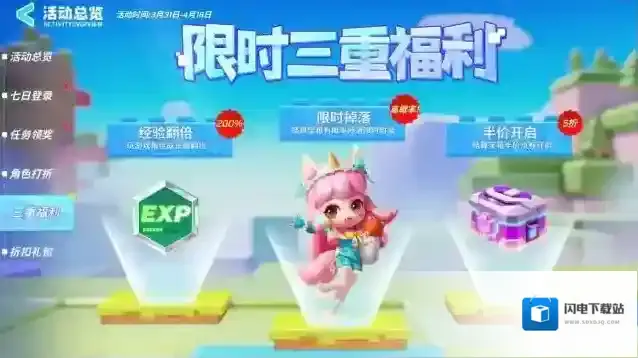 3月31日至4月16日期间,三重福利在等着少年们~经验翻倍:玩游戏能让角色成长值翻倍!限时掉落:结算宝箱将有高概率掉落限时时装,内含小狐狸·彩虹梦境套装!半价开启:结算宝箱可使用半价点券开启!5、折扣礼包