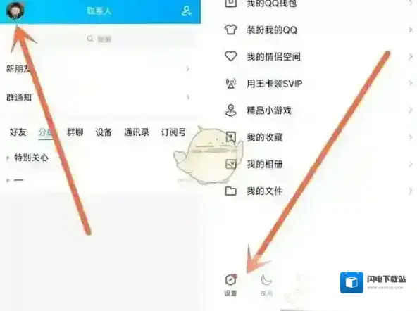 1、打开QQ,先点击左上角头像,再点击右下角设置。