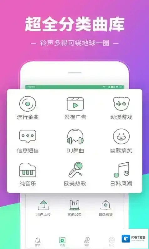 3、流行金曲,影视热曲,动漫游戏,短信闹铃,DJ舞曲,搞笑另类,网络神曲,多种类型等你来挑,还有网友自定义上传,让大家聆听你的声音。