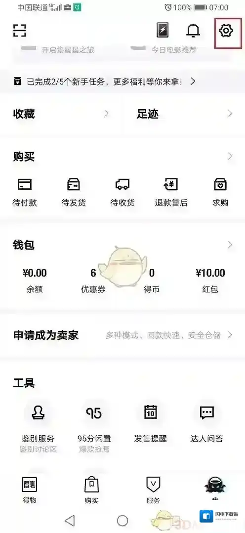 2、进去得物个人中心之后,点击“设置”图标,