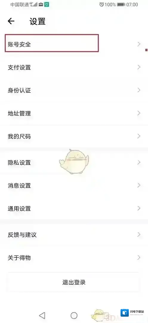 3、在得物设置中,点击“账号安全”,
